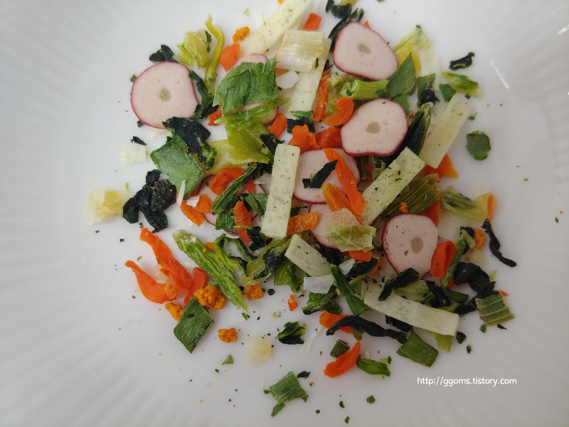 건더기는 푸짐한 편이네요. 건당근, 건양배추, 건청경채, 건조지단, 오징어후레이크, 홍합볼후레이크가 들어 있어요.