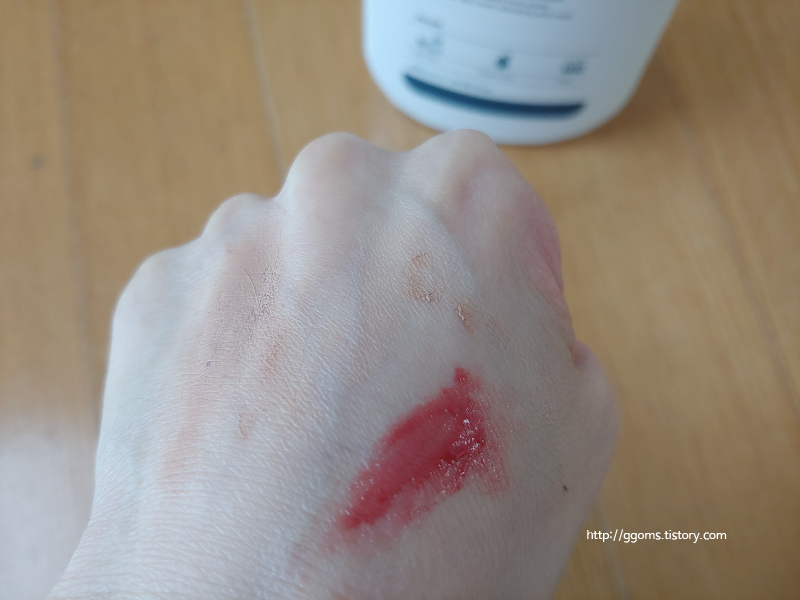 클렌징력은 어떨까 싶어 손등에 립스틱과 파운데이션을 발라 보았어요.