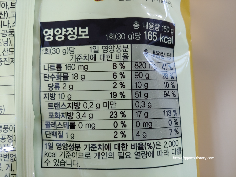 칸츄리콘 150g 한 봉 전체 칼로리는 835kcal이고요. 30g당 칼로리는 165kcal입니다.