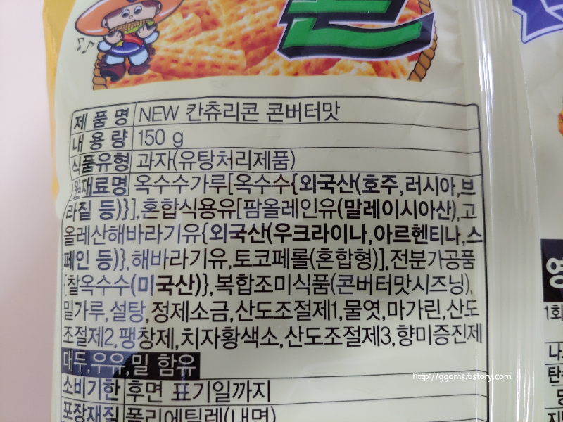 버터맛 옥수수과자로 옥수수가루 44%, 콘버터맛시즈닝 4.9%(슈퍼스위트콘 6.3%, 가공버터 1.1%, 건조버터 0.2%)가 함유되어 있네요.