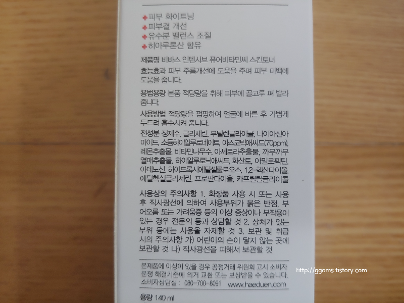 정제수, 글리세린, 부틸렌글라이콜, 나이아신아마이드, 소듐하이알루로네이트, 아스코빅애씨드(70ppm), 레몬추출물, 비타민나무수