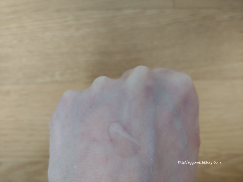 스킨토너를 손등에 펌핑해 덜어내었습니다. 투명한 점성이 있는 제형으로 발라서 가볍게 두드려 흡수시키면 되는데 바르니 촉촉하네요.