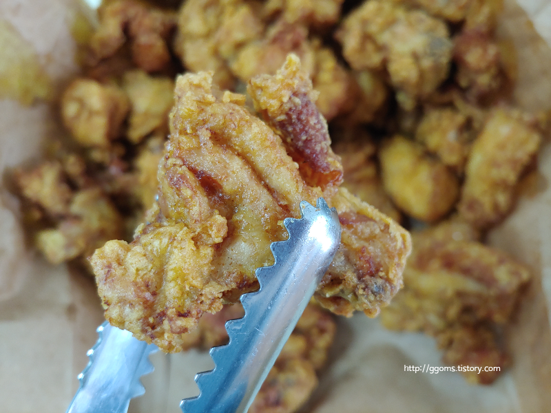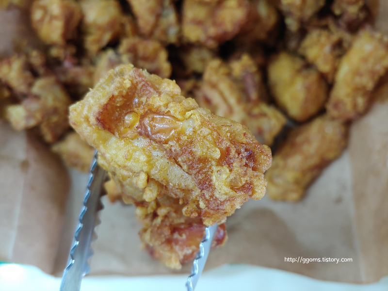 먹어보니 튀김옷이 바삭하네요. 옥수수 전분으로 만든 튀김옷에 가마솥에 튀겨서인지 더 바삭함이 느껴지네요. 그리고 노랑통닭은 저염 치킨으로 유명하지요. 별로 짜지 않아 좋은 듯합니다.