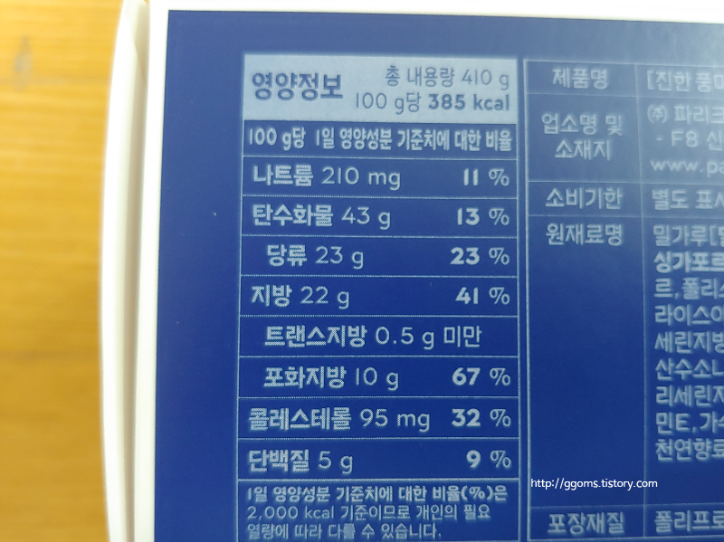 영양정보예요. 파운드 케이크 총 내용량이 410g인데 총 칼로리는 1,580kcal, 파리바게뜨 정통 파운드케익 100g당 칼로리는 385kcal입니다.100g당 영양성분 함량은 나트륨 210mg, 탄수화물 43g, 당류 23g, 지방 22g, 트랜스지방 0.5g 미만, 포화지방 10g, 콜레스테롤 95mg, 단백질 5g이네요.