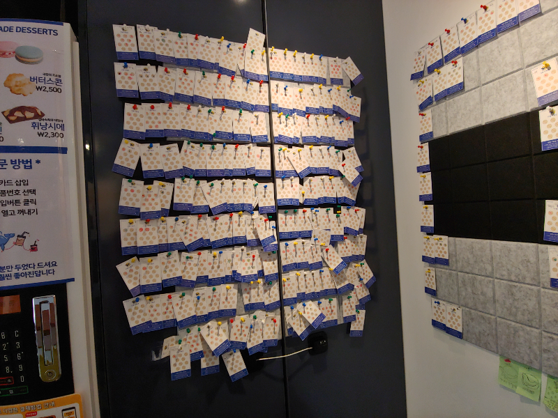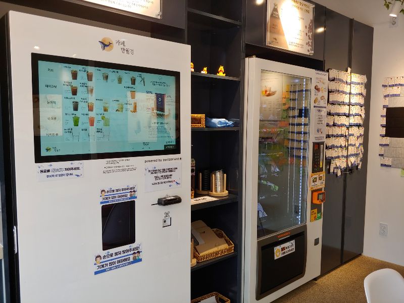 그 옆에 음료 머신이 있고, 그 옆에 셀프바, 그리고 또 그 옆에 디저트 자판기가 있어요.