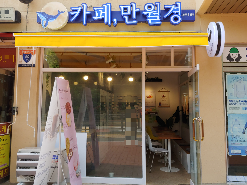 가람마을 11단지 상가 쪽에 위치한 카페 만월경 파주 운정점 무인카페예요. 만월경이란 '고래가 유영하는 달빛바다'라는 뜻이라네요. 그래서인지 간판에 고래 그림이 있습니다.